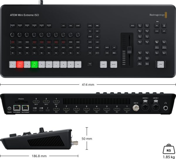 ATEM Mini Extreme ISO G2 is a powerful yet compact live switcher for building a high-end broadcast studio. Get an expanded professional style control panel with built in streaming, 8 standards converted HDMI inputs, 3 independent HDMI outputs, built in streaming engine, multi-view, CFexpress and Thunderbolt for record/playback. There is also 10G Ethernet for fast network storage access, XLR audio inputs, USB webcam, DVE, chroma key, media player and ISO recording of all 8 video inputs.